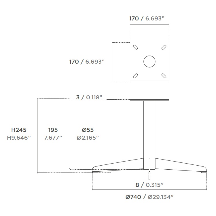 Pata Base Giratorio Argon (Pata Ø740×8, Tubo Ø55x195x2, Plato 170x170x3, H245) Niquel Satinado